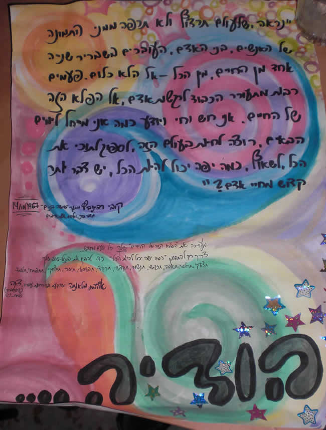 THANKSGIVING "it seems, that for ever will persecute me and not let me go - the picture of people, of humans, as they pass from life in the split of a second, into the Nothing. "Many times respect arises towards the feelings of Man, towards this miracle of Life. "I sense and live and know how much I yearn for the coming days, I want to live in this world, to absorb into myself everything, to breathe in, how beautiful everything can be, is there something holier than human life?" Kobi Rabinowitz from "6 sons" 14/10/1967, Sinai Desert, Six Day war, Dina addresses Tzippi: I appreciate "this miralce of YOUR life" in order to understand your "Good Luck", scream, dream, love, feel, breathe, ? , dance, express, (my word: te-va'abe'ee), cry, laugh, evolve, learn Loves you fully-fully and sinks into memories of Days passed (nucleus Dror , ?) Dina and Tzippi, like Meshi and Boris, were together in the youth-movement of "No'ar Oved" and in a group called "Dror" i.e. Freedom. |