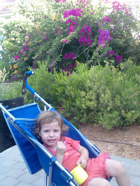 ![]() Now she wants to get out of the stroller, an even more difficult task to do with only one hand |