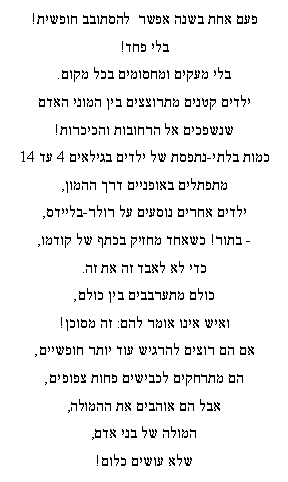 ![]() Some people go back to the Cultural Center to pray Mincha, the afternoon prayer, others pass by, because they come from other synagogues. And again the children on bikes, korkinets and roller-blades. |