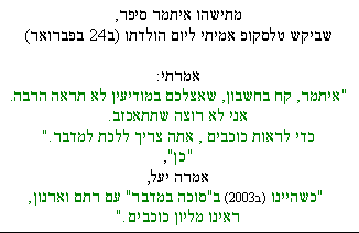 Itamar's dream of watching the moon through a professional telescope, dreamt during the half-hour drive between his and his cousins' house, became a reality on Pesach - during holiday with grandma in the desert. "For only in the desert will you enjoy your telescope, once you get it!" "Yes", said Yael, "when we were in "Succah in the Desert" we saw a million stars!" |