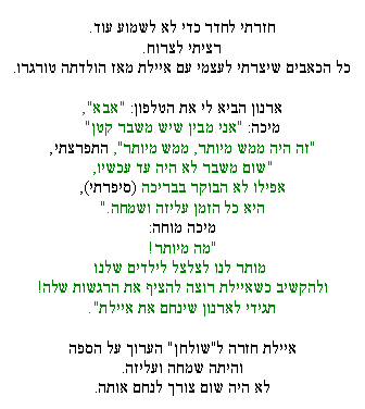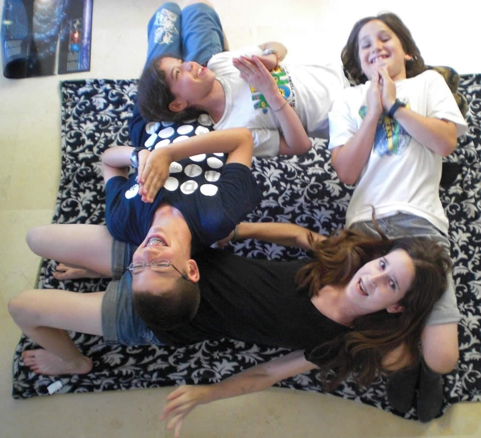 ![]() Sometimes the two boys pair up, sometimes the two girls, sometimes the two "big ones", sometimes the two "little ones". Sometimes Itamar plays apart from the three others. Sometimes Arnon realizes a project, meant for all four. Yael never plays by herself, nor does so Ayelet. |