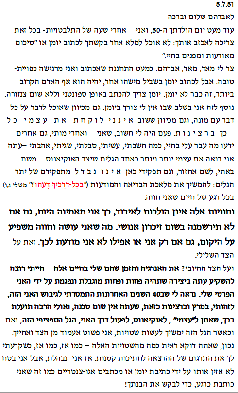 Having just finished a letter to the Berkeley Holistic Health Center, I feel like sending another letter to the same area, to you. It is late at night, but having led such a permissive life today, just reading, thinking, meditating, doing Yoga and eye-exercises, watching some birds on my balcony, playing piano, talking to each of the children, whenever one came home, nourishing and being nourished by Mona for half an hour, and enjoying to write some letters on this IBM bilingual type-writer, which I got today – I am still very much awake. You already understand, that I have finally settled down. The "Get" was handed to me the day before yesterday, and simultaneously, though not in connection with it, all the problems, which can be solved, were solved. I even stopped the "chalturot" [not really serious work] , trying to enlarge my salary by giving lectures in colleges for the aged . It was not worthwhile concerning the money and only prevented me from creating the space which I need, in order to finish the business of the past and to let the business of the future (verbally!) prepare itself. There is only one lesson a week, which I continue to give, because it's 15 minutes from here and the audience is terrific. I also continue with the lectures in my institute of course. I assume, you got all the important news from Steve. You know then,