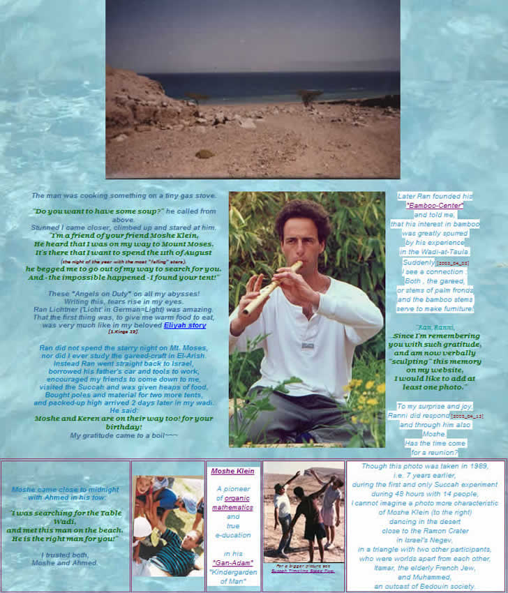 11-15, 1996: Moshe sent Ran to find Rachel "somewhere around Nuweiba in Sinai". Ran, indeed, found me, rescued me from risking my life for my vision, gave up his purpose to ascend Moses' mountain to see the meteor shower, traveled back by busses to his place then north of the Kineret: Chad-Nes, drove down to Kibbutz Nir Yitzchak to fetch the netshade I had ordered, and also to the Succayah, and came back with ever so much equipment, which was necessary for establishing and running the first "Pyramidion". " Moshe and your friend Keren will come soon, for your birthday!" It was then, that Moshe - sitting with me under a rock, prophesied, that "until 2011 the World will change". At that time nobody talked about the Mayan Calendar and the end of 2012! 15 years later, on August 13, 2011 Our "talking-among-each-other" revolved around the "rock", SELA, the name of the street, in which my children now live at Shoham. Moses should have "talked" to the rock,