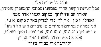 ![]() "The shade of the hands of the living God may be a refuge for you if in wholeness and truth you seek refuge in him Your step will be directed on the day of the walking your hand he will hold on the day of the doing seek peace, and pursue it. [Psalm 34:15] isn't he the lord of peace and peace he shall make." The poem sounded like "Jehuda Halevi" and, indeed, I found the first line among "different prayer poems" of Jehuda Halevi In the center of the backside I decyphered: "Sehnsuchts-Postkarte Norwegen" "Postcard of Longing Norway" Efrat's sister-in-law decyphered strange numbers on the stamp: 8620 Wetzikon ZH 9-293-19 |