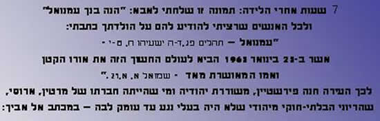 ![]() Chana's reaction to the Biblical quotes, on which I based the name of my child. This is a part of a collage from a slide-show which I created for Immanuel's 40th birthday, 2003 |
