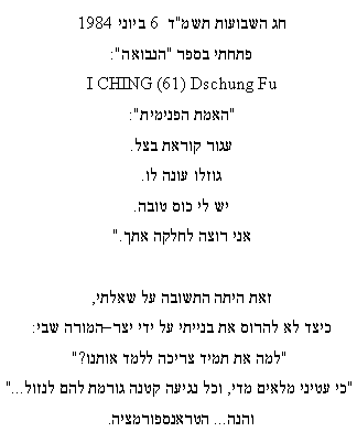![]() Translation: On the Feast of Shavuot 1984 I opened a passage in the book of "prophecy" I Ching Dshung Fu which became the answer to my question, how not to destroy what I build by my teacher impulse: "Why do you always have to teach us?" "because my udders are too full, and the slightest touch causes them to flood!" And there - there came the transformation |