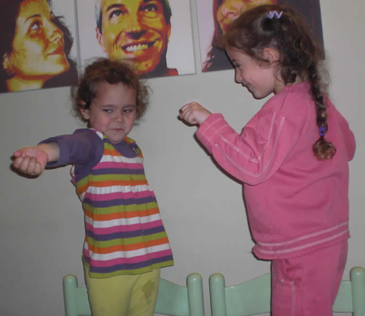 and the little girls stand on their chairs demonstrating