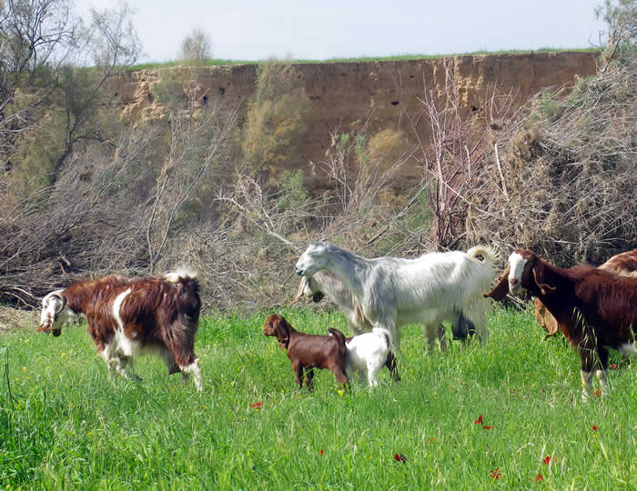 loves animals! My name, Rachel, means "mother-sheep", and is also the name of the first shepherdess in the Bible. This Rachel, the second and beloved wife of Ya'acov, later became an icon: "The Mother of Israel". I enjoy the contrast between those cows in the water on the other side of the planet and these sheep and goats, which Immanuel caught, while on a recent bike-trip with his friends in Israel |