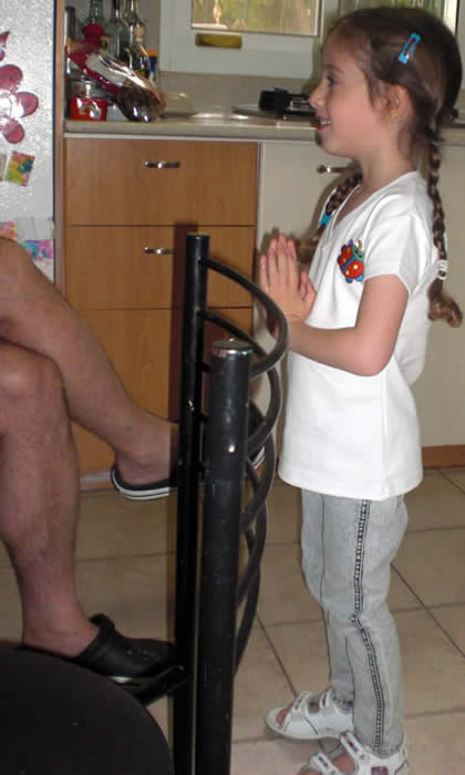 ![]() and then, how Mika meets another kid, and then how Mika passes by the guard and enters her kindergarden with Abba. Both meet Orit, the main kindergardener, who favors Mika, so that Mika favors her. "You want to take photos?" she says to me and shoves us towards a fitting background! Here they celebrate Independence Day already today. |