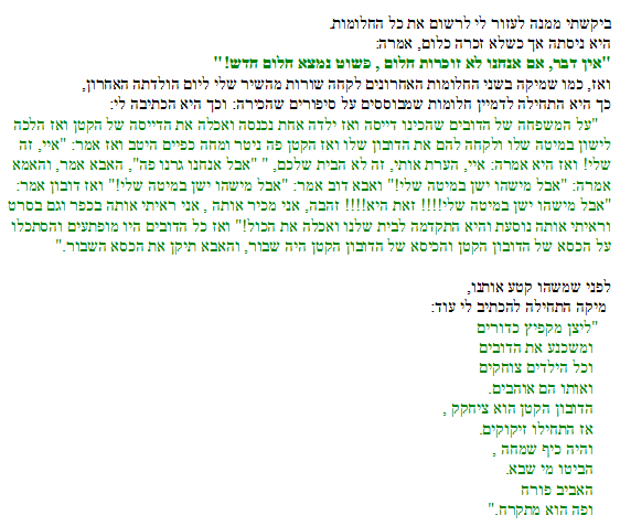 some futile attempts to soothe Mika, I had an idea: Instead of fighting the bad dreams, I suggested to focus on imagining good dreams. "Image a dream, in which you do what you like to do!" "Oh, I like to do many things!" And so she numbered Dream Number 1, Dream Number 2 till Dream Number 27, when Imma came in and sent her to sleep, but in the morning she stormed into my room: "I know Dream Number 28! The bridegroom and the bride marry, and one loves them and the audience claps their hands and all the people are doubly glad, what fun at the wedding there is much joy etc. etc. - in a rhythmical, even rhymed form. Most dreams involved other children, or Nature, or were phrased as rhymed "poems", or dealt with something that still troubled her, like: "I am dreaming about (this and this boy), when we played (this and this), each one said: 'I caught it, I caught it!' " Seeing her sad, I said: "But you want to dream good dreams! In a dream everything is possible!" "Yes! in the dream we are getting along well with each other!" |