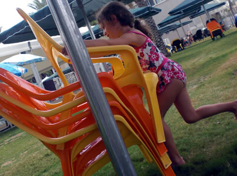 Mika is fond of engaging in technical tasks - like lifting a chair from the heap and putting it under the palm-tree for us