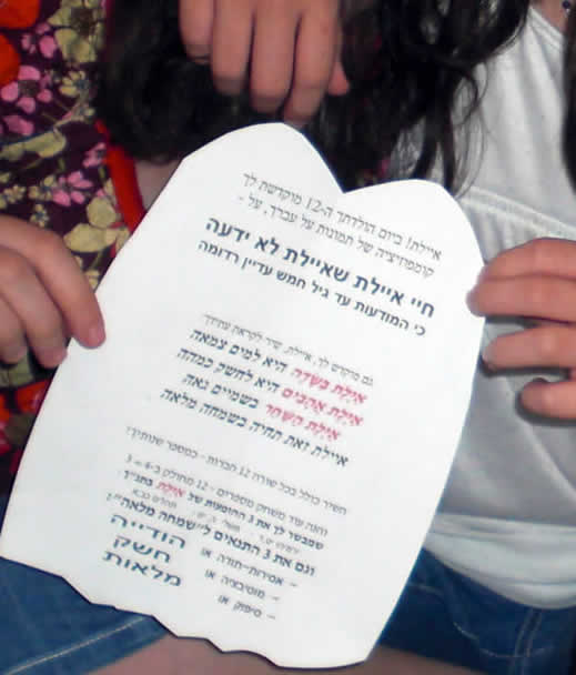 "It looks like the ten commandmends!" said Ayelet, when I showed them what I had created for her. "Yes, indeed! When I now received the print-out, I started to make a pretty clipping, and that's the result". I sang the 4 lines of 12 syllables 4 times, between explaining my intention. But I'll insert the tune only on the date of the Bat-Mitzva celebration |