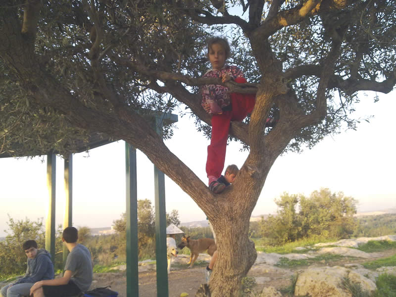 We had two bike-riding experiences which differed from each other. In the morning Mika asked me to take her bike with us, and I said, that she could drive to wherever she wanted. She wanted to go to the nearest playground, soon tired of driving and preferred the "mitkanim", the kids facilities. But then came a friend along - on a bike! It could have been wonderful, for the boy was considerate, not wild. But still- he was "better" than Mika. Mika could not stand it and wanted to go home. The boy accompanied her till the entry of Mika's house. In the afternoon, when I wanted to go out into Nature, Mika preferred to again go to that playground, but without the bike. There were many children on this sunny Shabbat, and she enjoyed herself greatly. Then it got even better: Her friend Lin - a girl ! - came along - on a bike! So what now? - go and fetch Mika's bike? I could have done so, leaving Mika with Lin's father but I wanted her to feel the regret of not having taken the bike. Lin was kind enough to exchange roles with Mika, sometimes Mika drove the bike and Lin ran after her and sometimes the other way round. Thanks to Lin's generosity there was no chance that Mika would fall into the trap of her competitiveness |