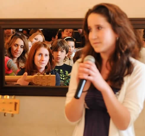 These pictures in the mirror were taken before the performance, when I had a talk with Yael: After having heard the rehearsal, I felt, I needed to encourage her, to sing with confidence. Her sister Rotem claimed, that this was unnecessary, but Yael's singing during the performance was, indeed, much more confident than during the rehearsal... |