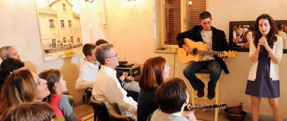 ![]() Now begins the deeply moving duet of Jonathan and Yael, Yael partly singing, partly playing the clarinet. Rotem -seen in the mirror next to Efrat, was meant to take part too, but there was only one microphone. I'm so sorry, I did not bring my digital recorder, but later I learnt the song about the brave cypress by heart and I keep singing it with great joy ever so often in the pool |