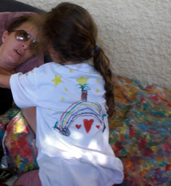 On the now re-arranged veranda of Grandma, with the now more pleased Efrat and with Mika's own painting on her summer-school shirt |