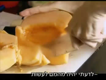 Except for closing his eyes for a moment, the face of Elihav does not show, what he felt, when three judges so harshly criticized his error of having defreezed the fish with water. Chaim: "the Japanese say that it's forbidden to rinse the meat of the fish with water, for they say, that also the water is cooking. You took the Salmon and defreezed it with water and even added drops of hot water" |