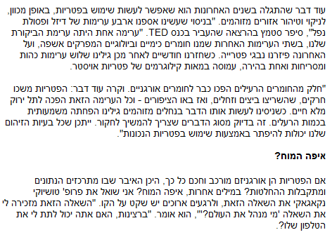 | Article in "Calcalist" 11.08.11 What do mushrooms think about? How did the Internet hide under the earth for millions of years? What does the social network of the mushrooms teach us about human intelligence? |