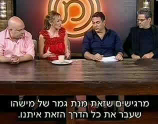 "Immanuel, Avi, Elihav - the three great ones ...within less than an hour we must part from one of you. The two who'll remain, will cook the dish of the Finale which will determine who'll be the Masterchef of Israel. You'll present it to us "live" to the 100 tasters, that came here especially. Michal; "Also your families came here ... |
