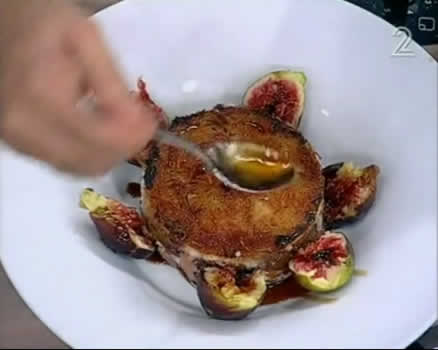 "At the edges it tastes burnt, Roshfeld: "Very much" Michal: "but in the center not" Roshfeld: "yes, but a dish is made from all directions." Eyal: "This is knaafeh of Ricotta, Ricotta is not a cheese, which can be handled at high temperature" Michal: "This is the mistake" Eyal: "It is as if it gets decomposed into its "gaeben" (there is no such noun, the verb means: to make cheese) and then all its softness that you expect inside, that the crispy layer will explode into such a warm cream, doesn't happen here , it's a cold cheese, the Ricotta." Michal: "But he chose Ricotta, because he wanted it to be delicate!" The only and biggest mistake is the high temperature., which changed the flavor of the knaafeh, and gave it a kind of burnt taste and decomposed the cheese totally." |