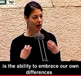 in the USA sent me a link to the NIF (New Israel Fund) website, and in it the video with the speech of the new Labor Knesset-member Meirav Michaeli: [she is 46, like my youngest son, and granddaughter of Rudolf Kastner - what a tragic figure!] Listening to the end of the speech, one could believe, that she is a pupil of Right Use of Will and Godchannel. But she does not say, h o w we can learn to accept all parts of ourselves. "... the ability to embrace the differences [shoni] in the other, .... is the ability to embrace our own differences [shoni] the being-different [shoni] in each and everyone of us this is the ability to live in peace with ourselves. Only the ability to stop repressing [lidkhot u-le-hadkhiq] those parts of society, that we have labeled "not-us", "not part of us", only the ability to accept ourselves only when we allow all parts of ourselves to be fully present, to fully participate and to enable them to contribute their full contribution, with their full power, will we become a whole and healthy society!" |