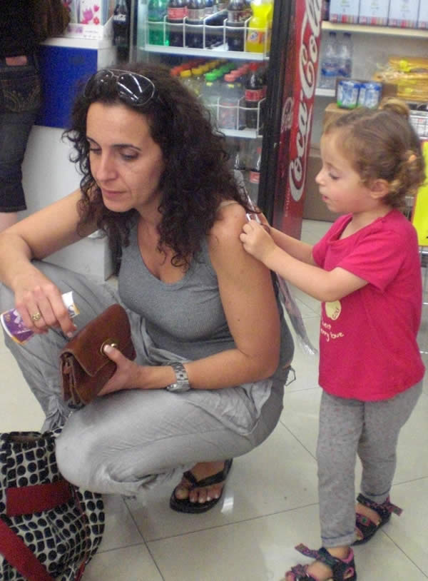 While Efrat looks for her purse, Mika massages her back with the crown-bag: