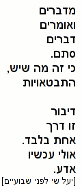 of g e f u e h l t e - g e f u e l l t e Z e i t "inmitten der Ewigkeit", f e l t - f i l l e d t i m e "amidst eternity" from the beginning of my 76th till the completion of my 90th year [unless I'll die after all] "A dream is our life on Earth ...we measure ...(it) in space & time" -see 2013 songs August Nr. 4- Yes, I, Christa-Rachel Bat-Adam, want to measure my life on Earth in space & time! 4 days of feelings will be inserted on each of the 1400 pages [set up between 2001-2008] continuing with M E E M and then following the order of folders and files on my "local site". The feeling chosen from a day is exhibited in max. 7 lines per day since August 28, 2013 On 6 days of the week I learn, but Shabbat is dedicated to my main feeling: grate-full-ness. Since feelings must be vibrated and wombed, each day symbolically closes with a song, following the order of SongGame 2007, which includes my own songs from 1967-2011, and from then the songs created by myself or learnt from others in 2012, 2013 till 2028... To challenge myself like that -while not knowing what will be "staged" in my personal and in the world's drama till 2028 , exhilarates me! |