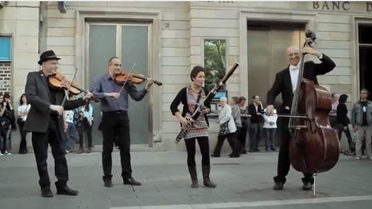 girl threw a coin into the hat [this was probably staged], the contrabassist comes out alone, the only one in "orchestra clothes", starts to play, the cellist joins him, gradually more musicians come out of this house, join the music one by one, in their street-dresses, more and more people gather around them, or intermingle with them, many children, many fathers with children, young people, old people, pretty people, ugly people, some frowning, but most rejoicing. It seems to be the commercial campaign of a bank. I wished all commercial campains could let us feel for a moment "Heaven on Earth" |