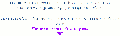 of g e f u e h l t e - g e f u e l l t e Z e i t "inmitten der Ewigkeit", f e l t - f i l l e d t i m e "amidst eternity" from the beginning of my 76th till the completion of my 90th year [unless I'll die after all] "A dream is our life on Earth ...we measure ...(it) in space & time" -see 2013 songs August Nr. 4- Yes, I, Christa-Rachel Bat-Adam, want to measure my life on Earth in space & time! 4 days of feelings will be inserted on each of the 1400 pages [set up between 2001-2008] continuing with M E E M and then following the order of folders and files on my "local site". The feeling chosen from a day is exhibited in max. 7 lines per day since August 28, 2013 On 6 days of the week I learn, but Shabbat is dedicated to my main feeling: grate-full-ness. Since feelings must be vibrated~ wombed, each day closes with a song, fitting the 7 lines To challenge myself like that -while not knowing what will be "staged" in my personal and in the world's drama till 2028 , exhilarates me! |