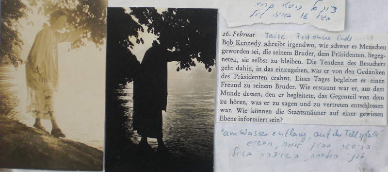 paper-composition, 1985, I loved very much, "suggested" to be relevant for me now: My mother, pregnant, shortly before delivering me to this world, on a holiday with my father. "Along the water" she wrote Next to it a quote about how people "changed" in the presence of Pres. Kennedy. This is my plight: "you bring out the best in people, but also the worst" (Mona in the early eighties) Above it [below on this page!] a calender-clipping [1954?], on which I drew the view which I most favored while growing up in Germany, a view - not in Israel, a view - not in the desert. |