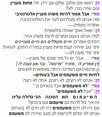 next day, in another interview in the program "osim seder hadash", with both authors of Highway 90, Modi Bar-On and Anat Seltzer, Modi added another term, not "interesting" but "meaningful": Since the border with Jordan is secure and people's heroism is no longer needed, their life has become "meaningless", Modi said. How very sad! |