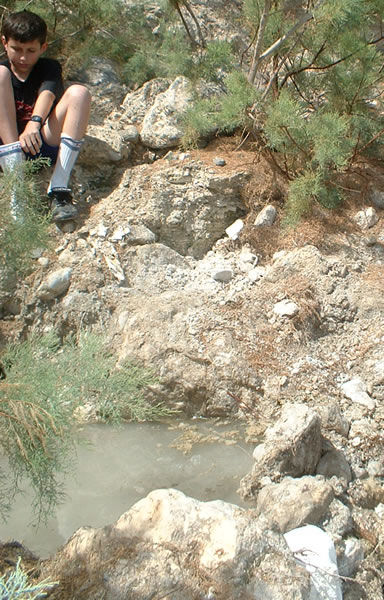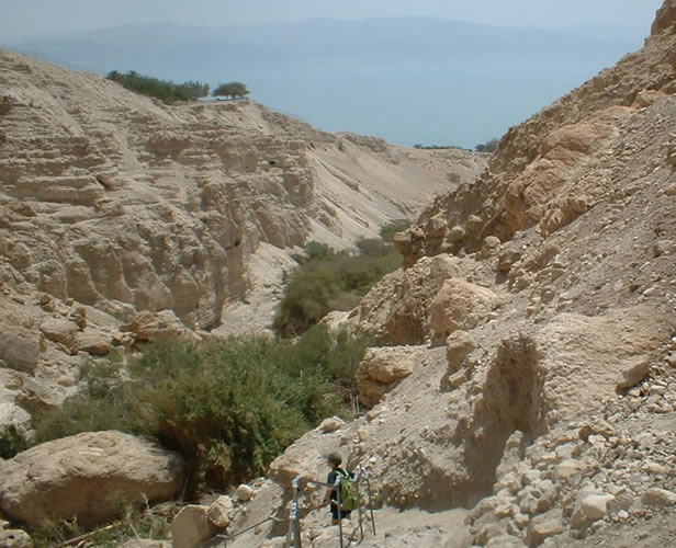 Jonathan looks up to the green island on the ridge, the park of the Ein-Gedi