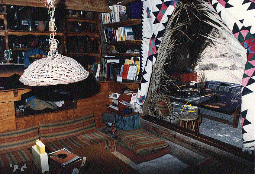 on the seats in front of the tables on Ram's "veranda" indicates the place where Ram invented the pyramidal tent |