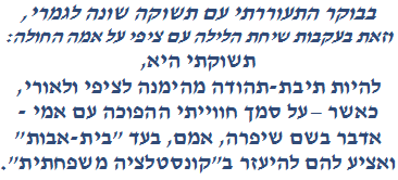 also to be a boundary, against which the beloved can grow". 20 My desire is that the experiences and the information will come to Micha, which willl allow him to do his "lekh-lekha" from the world of hightech- to fieldwork in the desert as he yearns to, work which will give him zest-full-ness and full-fill-ment. 21 My desire is to believe with all my heart that I planted a seed in the heart of Jibril, the Bedouin teacher, (see also below on Oct. 11-12) and that he will "go-out" (exodus) from victimhood to sovereignty. 22 My desire is, that the new start of Immanuel- Efrat- Mika-Tomer in their Shoham apartment will be accompanied by joy and co-creation 23 My desire is that tomorrow, too, the co-creation of the three of us will be just as harmonious, but that we shall be listening more to our body - and if we still require too much from our body , that it may forgive us and cooperate with us. 24 My desire is to understand how to relate to the excessive consumerism of my children and people in general, and to the discarding of objects if which many people in the world are in need. . Do I have a judgment , a belief, a false premise here? How am I not "aligning with Source" and suffer so much? I am pushing against something! what is it that I should desire? 25 My desire for tomorrow - with 4 challenging actors in my drama - is to stay connected to my Source in every moment, without judgments inside or towards the outside, and if I still should "create" stress for myself - not between me and them but between them, I desire to check and to communicate (without words) my goal for each one of them and for the togetherness between us. [See my recent song: "I inhale God and I exhale love to whatever I am feeling right now!"] 26 My desire is that tomorrow I will start to heal my recoiling from Tomer's presence in this house and in general, and that I "womb" us both in my womb. The next day I realized: I recoil only from Tomer's inaction. My fear of other people's boredom (shi'amum) screams to Heaven (shamayim). [See the bored boy] 27 My desire is to understand, how to relate to three distresses of mine: 1) lack of intensity, 2) consumerism and waste in my surroundings and in general, 3) the boredom of some of my grandchildren and of most people in the world 28 My desire is that tomorrow I reach "alignment with Source" regarding my recoiling from Tomer, my grandson, regarding both: "Boredom vs. Heaven" [shi'amum vs. shamayim] and regarding my love to him in general. 29 My desire is that Efrat may focus on "good-feeling thoughts". Especially when she meets with or separates from Emmanuel before or after the flight. 30 My first desire is that Efrat and Talli and Levi and Ayelet will grow into a wonderful partnership, as co-creators, zest-full and full-filled. My other desire is that Micha and Ra'ayah will grow toward being capable of creating for themselves a circle of friends " |