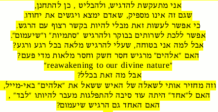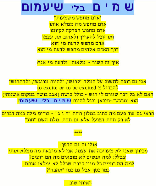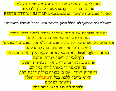 on Febr. 16, 2012, after the song, which contains all I am, know and want, seems to be completed, though the - already recorded and edited tune - will appear only on the shemshem = shamayim bli shi'amum website. A - frustrating - response to this letter came only from Shuli Natan's producer....